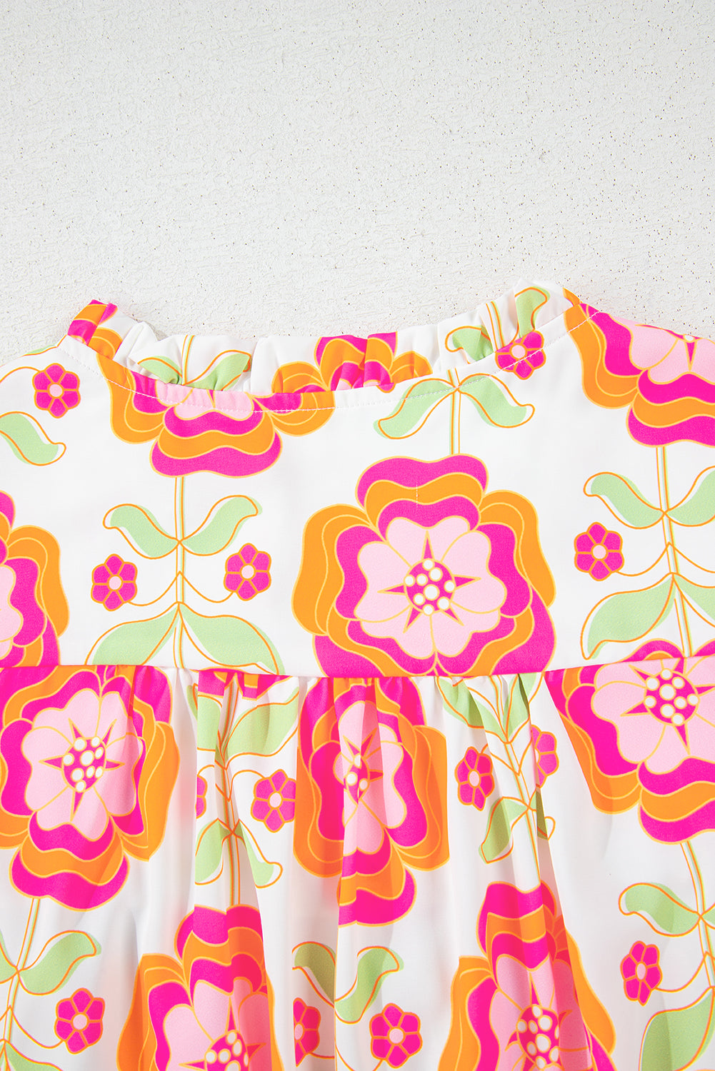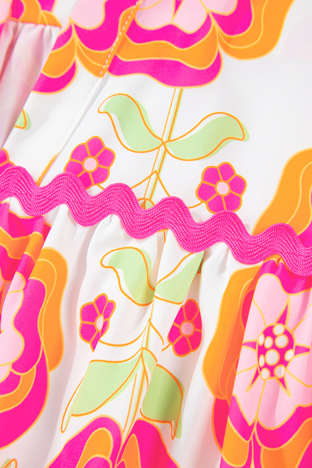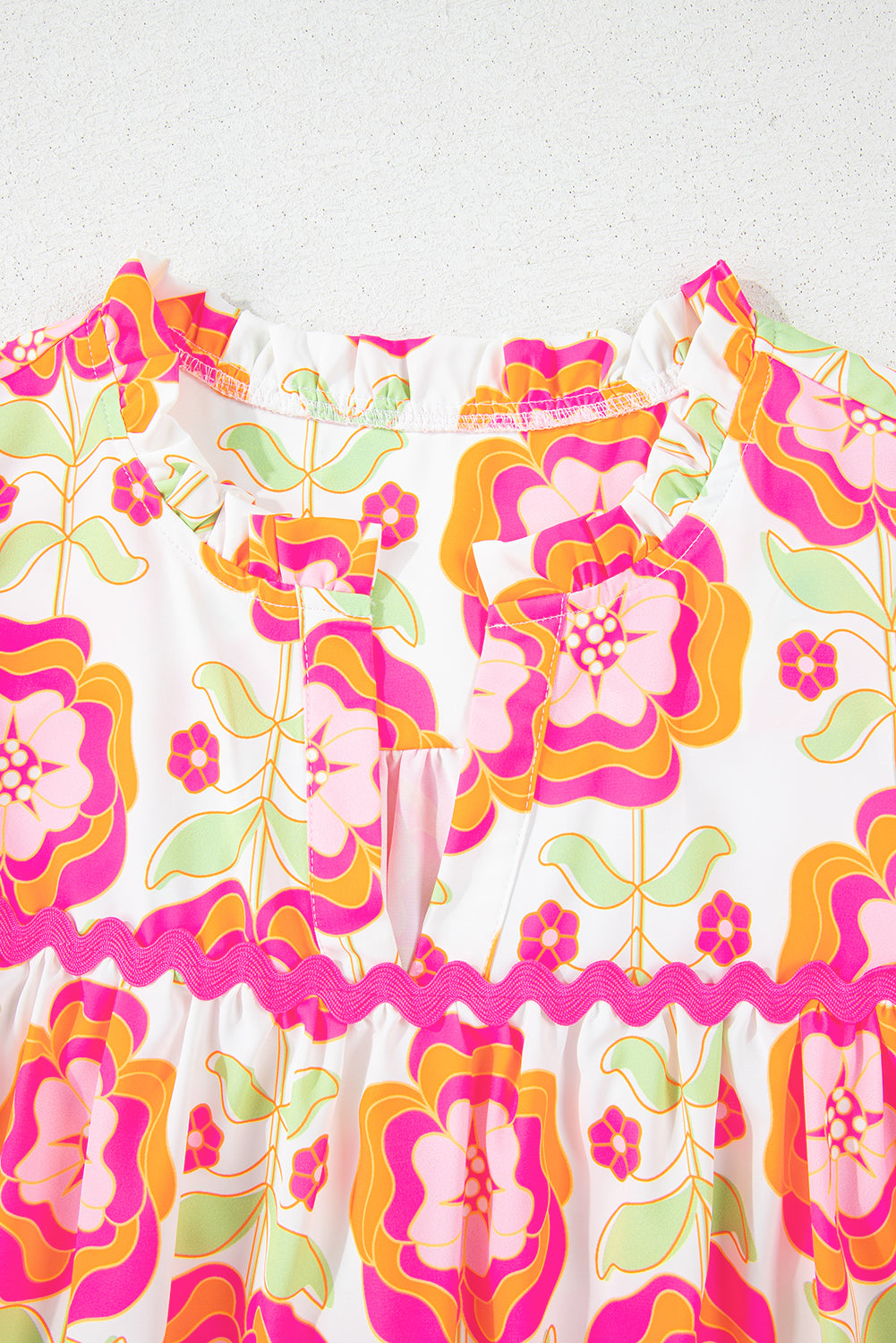 Rose Floral Ruffled Sleeve Ric-rac Trim Split Neck Loose Blouse